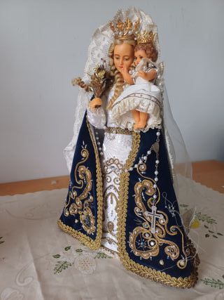 Figura religiosa de la Virgen con el Niño Jesús. La figura está ricamente decorada con detalles dorados y perlas. - Vestimenta detallada con bordados. - Corona dorada en la Virgen y el Niño. - Manto azul oscuro con adornos. - Velo de encaje blanco.