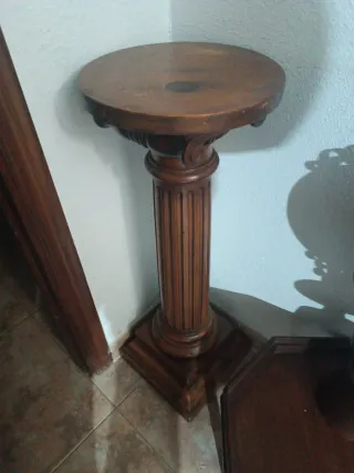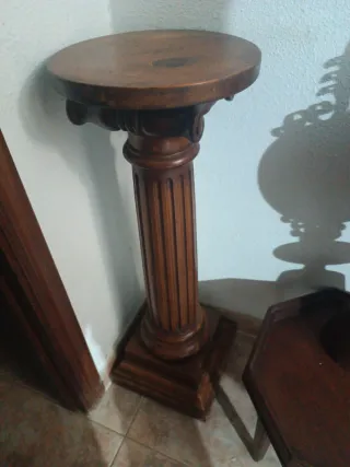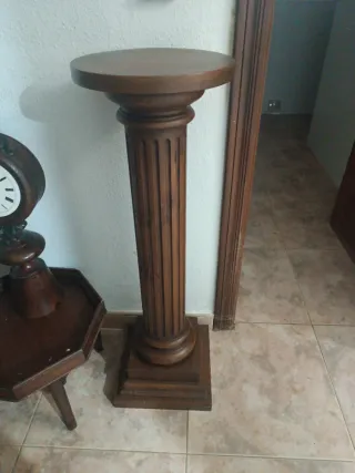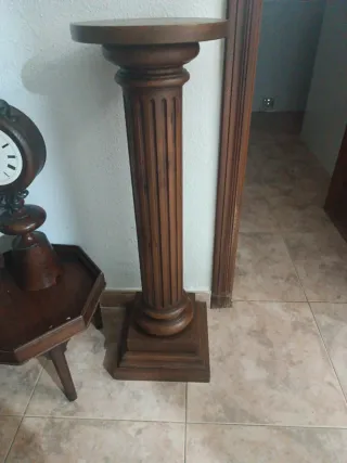 Elegante columna decorativa de madera. - Diseño clásico con detalles tallados. - Base cuadrada y robusta. - Acabado en tono marrón cálido.