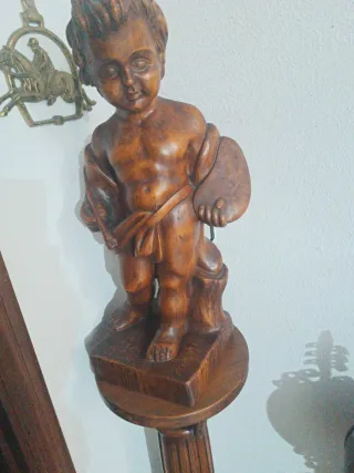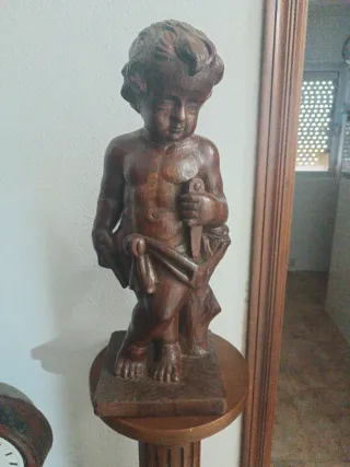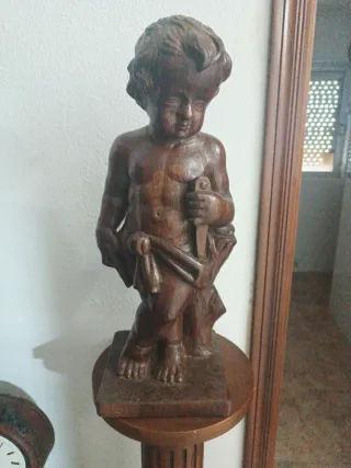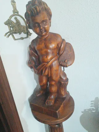 Figura decorativa de madera que representa a un niño sosteniendo una daga. La pieza está montada sobre una base de madera con un diseño clásico. - Material: Madera. - Diseño: Niño con daga. - Base: Incluida.