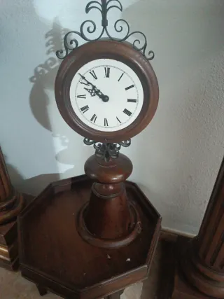 Elegante reloj de pie con estructura de madera. - Base octogonal. - Detalles ornamentales de forja. - Esfera con números romanos.