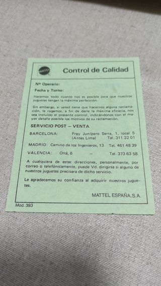 Documento Control de Calidad Mattel Años 80