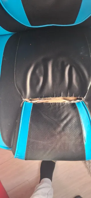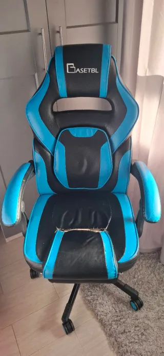 Silla de estilo gamer en colores azul y negro. Diseñada para ofrecer comodidad. - Tapicería en polipiel. - Base con ruedas para fácil movilidad. - Respaldo ergonómico. Acepto ofertas.