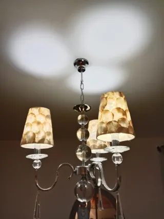 Elegante lámpara de techo con un diseño moderno y sofisticado. Aporta un toque de luz y estilo a cualquier estancia. - Estructura con acabado plateado. - Pantallas con un diseño texturizado en tonos cálidos. - Detalles de cristal transparente. - Elementos decorativos esféricos.