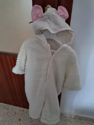 Disfraz tierno de oveja para bebé, perfecto para fiestas o carnaval. - Mono completo de peluche blanco. - Capucha con orejas de oveja. - Cierre frontal con velcro