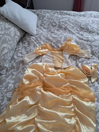 Disfraz de princesa Bella, inspirado en el clásico cuento. - Vestido largo de color amarillo dorado. - Mangas abullonadas. - Detalles dorados en el corpiño. - Falda con volantes y drapeados. Talla 4-5 años