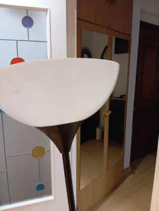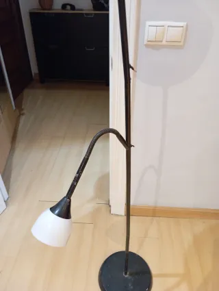 Elegante lámpara de pie con un diseño moderno. - Pantalla de cristal blanco. - Base y pie en tono marrón. Le falta el cable del enchufe