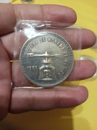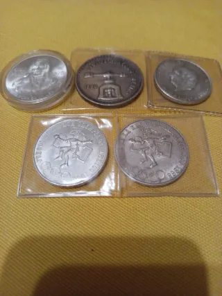 Conjunto de cinco monedas de plata de México. - Una moneda con la leyenda Independencia y Libertad. Hidalgo - Una moneda con la imagen de un personaje y la inscripción Cien Pesos Plata Pura. Morelos - Una moneda con la imagen de una prensa y la inscripción La Casa de Moneda de México 1980. Troy onza plata pura. - Dos monedas olimpiadas México 68