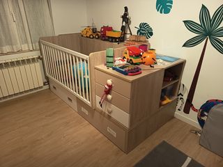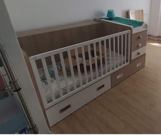 Cuna covertible Úsala como cuna de 140x70cm con zona para cambiador adosado cuando tu hijo es pequeño. Cuando crezca se convierte en cama 190x90 cm, escritorio, mesita. cajonera y estantería. Actualmente está montada como cuna. Se puede ver. Posibilidad de transporte y montaje.