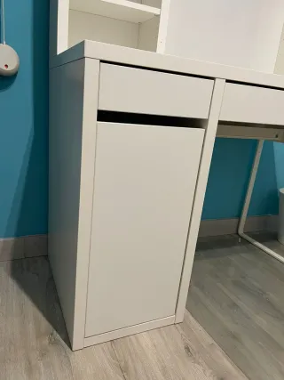 Escritorio blanco de IKEA con estantería superior. - Diseño moderno y funcional. - Estantería con compartimentos. - Hueco para cables.