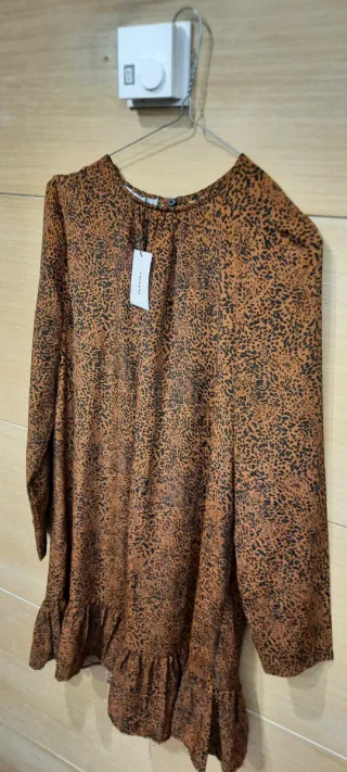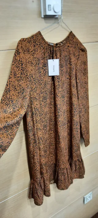 Vestido nuevo con estampado animal print de Lefties. Tiene un diseño con cuello redondo y manga larga. - Estampado de manchas en tonos marrones y negros. - Bajo con volante. - Cierre de botón en la espalda. Talla M No hago reservas Zara.mango.uterque.parfois.sfera.massimo dutti.bimba y lola.pull and bear.shein.primark.pedro del hierro.roberto verino.oysho.stradivarius.sprinfield.berskha.