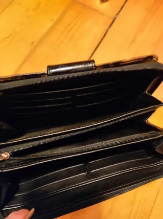 Elegante cartera con un llamativo estampado de leopardo. - Diseño brillante y moderno. - Cierre de botón a presión. - Detalle metálico con logo.