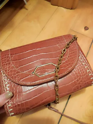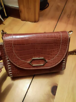 Bolso pequeño con un diseño elegante y moderno. Perfecto para llevar lo esencial. - Acabado texturizado tipo piel de cocodrilo. - Detalle metálico hexagonal en la solapa. - Cadena metálica dorada para llevar al hombro o cruzado. - Costuras decorativas en los bordes.
