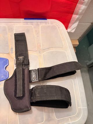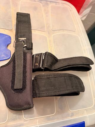 Funda pernera táctica de color negro, diseñada para llevar de forma segura y accesible. - Fabricada en material resistente. - Correa ajustable para la pierna. - Cierre de seguridad.