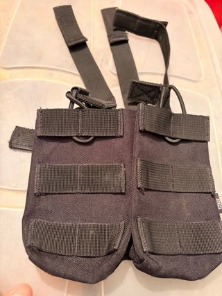 Funda doble para cargadores de G36. Fabricada en material textil resistente y con sistema MOLLE. - Color negro. - Cierre con solapa. - Dos compartimentos individuales.