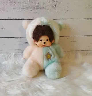 Peluche de Kiki con diseño de oso y temática de Géminis. - Cuerpo dividido en dos colores: blanco/rosa y verde menta. - Detalle de estrella de Géminis bordada en el pecho. - Cara de Monchichi con pecas y pendientes. - Capucha con orejas de oso. Ref 1612