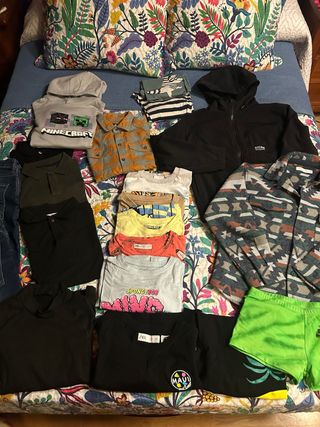 Lote de ropa para niño de 11 a 12 años. - Sudadera gris con estampado de Minecraft. - Camisa de cuadros naranja y azul. - Chaqueta negra con cremallera. - Variedad de camisetas con estampados. - Bañador corto verde. - 2 Pantalón vaquero. - Sobrecamica - Pijama - 3 polos - Camiseta térmica