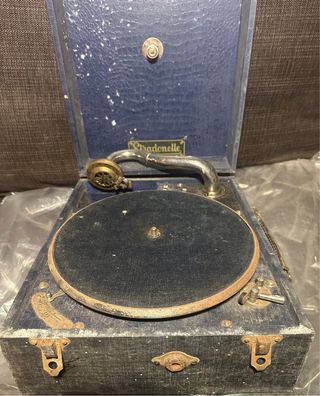 Gramófono antiguo de la marca Stradonelle que necesita restauración. Ideal para coleccionistas o aficionados a la restauración. - Diseño clásico. - Mecanismo visible. - Caja de madera con tapa. - Plato giratorio. -no dispongo de la manivela -no comprobada, para colección piezas o posible reparación