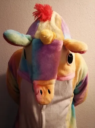 * Divertido pijama/disfraz de unicornio. * Mono de 1 sola pieza, con cierre delantero de botones y cremallera trasera oculta bajo la cola, tiene capucha y bolsillos. * Tejido de peluche, calentito, suave y confortable. * Diseño colorido y alegre. * Estampado de arcoíris, multicolor. * Ideal para fiestas o para estar cómodo en casa.