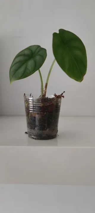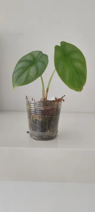 Planta de Alocasia en maceta transparente. - Hojas de color verde oscuro con textura. - Ideal para coleccionistas de plantas.