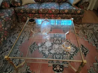 Elegante mesa de centro con un diseño moderno y sofisticado. - Tablero de cristal transparente. - Estructura de metal en tono dorado. En perfectas condiciones, cómo nueva A recoger en Gojar