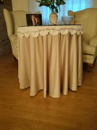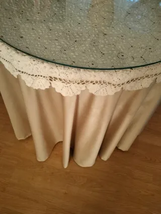 Elegante mesa redonda con un diseño que combina cristal y tela. - Cubierta de cristal transparente. - Base de tela en color beige. - Adorno de encaje en el borde. Se incluye cristal, faldón y tapete, unos 77cm de diámetro