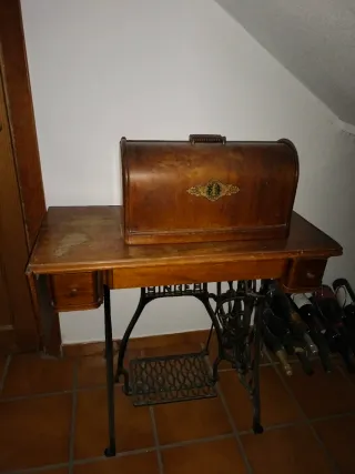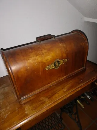 Máquina de coser antigua con su mueble de madera y base de hierro fundido. - Diseño clásico. - Incluye pedal. - Ideal para coleccionistas o decoración. No funciona, creemos que es la correa Para recoger en Gojar
