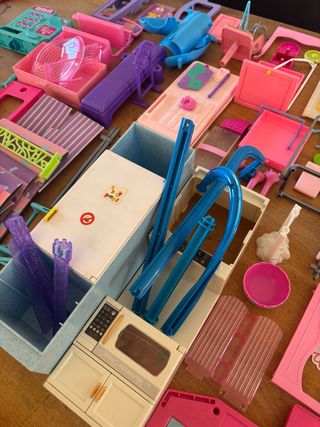 Lote de piezas y accesorios para muñecas Barbie y Sindy. Incluye elementos de plástico de varios colores. - Piezas de mobiliario y accesorios. - Colores variados como rosa, azul y morado. - Componentes para crear escenarios de juego.