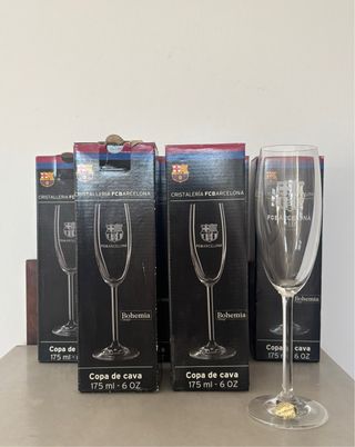 Conjunto de seis copas de cava con licencia oficial del FC Barcelona. Perfectas para coleccionistas o aficionados del club. - Diseño con el escudo del FC Barcelona. - Marca: Bohemia. - Capacidad: 175 ml (6 oz).
