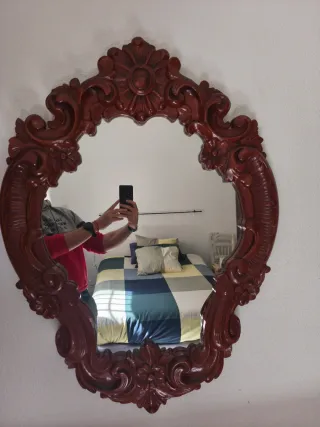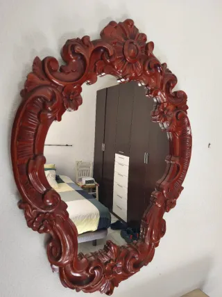 Elegante espejo con marco de madera tallada. Un detalle decorativo que aporta estilo a cualquier estancia. - Diseño intrincado y detallado. - Acabado en tono marrón oscuro.