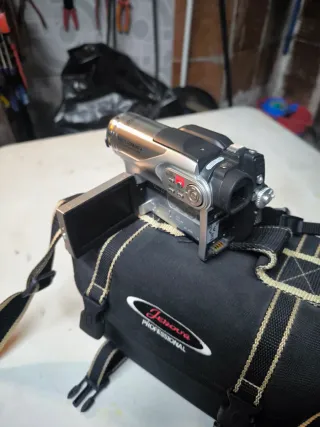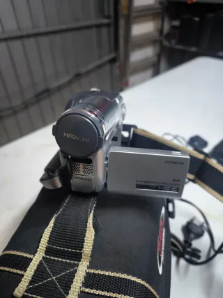 Cámara de vídeo Hitachi con pantalla abatible. - Modelo MULTI FORMAT+. - Diseño plateado y negro. - Incluye bolsa de transporte Jenova Professional. - Disco duro - Mini CD - Targeta SD