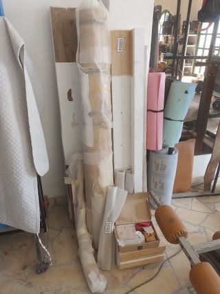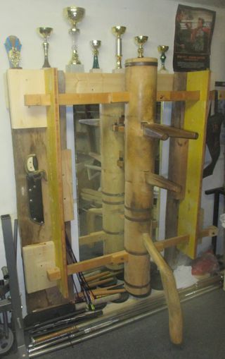 kung fu, wing chun, wooden dummy with frame. Used but funcional. some cracks, see photo. Frame repainted and disassembled. More or less flexible pickup in Granadilla! El Medano and San Isidro perhaps possible by arrangement - Estructura de madera. - Brazos y piernas de entrenamiento.
