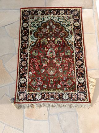 Preciosa alfombra Bijar de la India, anudada completamente a mano y fabricada en 1988, realizada en seda auténtica al 100%. La pieza incluye su sello original O.T.B. y el certificado de autenticidad, que garantizan su calidad y procedencia. Especificaciones: Origen: India (diseño Bijar) Año: 1988 Medidas: 92 × 62 cm Material: Seda pura Técnica: Anudado a mano Estado: Excelente — sin daños, reparaciones ni desgaste Extras: Incluye una barra de madera para colgarla fácilmente en la pared Esta alfombra presenta un anudado fino, colores intensos y un diseño clásico Bijar, lo que la convierte en una pieza elegante tanto decorativa.....
