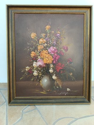 Medidas: a 68× 58cm (incluido el marco) Se trata de una pintura original al óleo, firmada F. Balogh, un pintor húngaro nacido en 1922 en Raab (Győr). El cuadro muestra un ramo clásico en colores cálidos y vivos, ejecutado con una técnica tradicional y decorativa. Incluye su marco original de madera en estilo vintage. La obra está en buen estado para su edad, con ligeras señales de uso. En la parte trasera se encuentra una breve nota biográfica del artista, típica de piezas del comercio artístico de mediados del siglo XX. Un cuadro decorativo y encantador – ideal para interiores vintage, decoración clásica o como pieza cálida para...