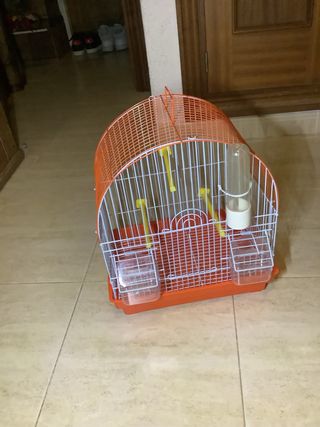 Jaula para pájaros con base y accesorios. - De unos 36cm de altura x 30 de ancho. - Incluye bebedero y comederos.