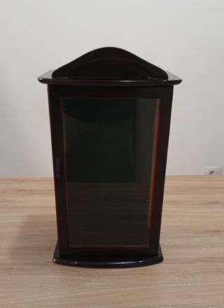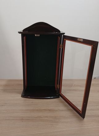 Elegante vitrina antigua de madera ( posible caoba o nogal ) y vidrio. Las vitrinas de este tipo eran comunes para exhibir objetos de valor, colecciones o piezas delicadas en hogares o tiendas. Ancho 30 cm, Profundidad 36 cm y Altura 55 cm.