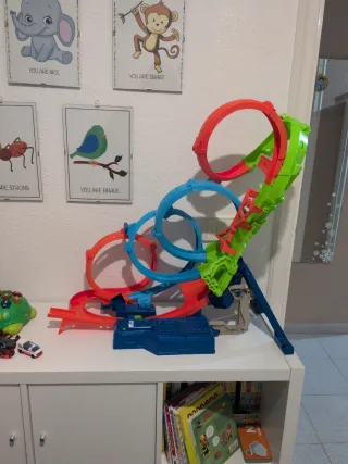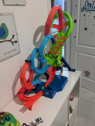 Circuito de carreras Hot Wheels con cuatro loopings. - Pista de color naranja y azul. - Base de lanzamiento azul. - Piezas de color verde.