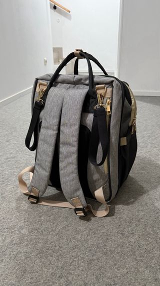 Mochila cambiador de viaje en color gris. Diseño moderno y espacioso. - Compartimentos interiores. - Bolsillos exteriores con cremallera. - Asas superiores y correas para hombro.