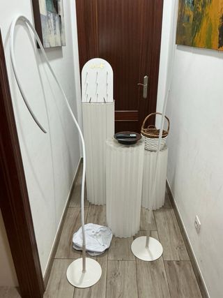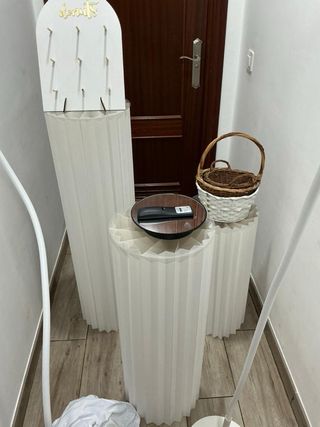 Cilindros blancos de diferentes tamaños, ideales para decorar eventos y fiestas. - Estructura acanalada. - Base redonda. - Incluye soporte para donuts.