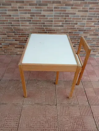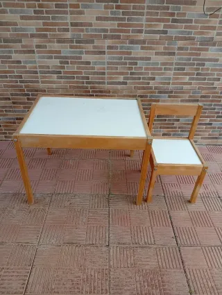 Conjunto de mesa y silla infantil de madera de Ikea, ideal para que los más pequeños jueguen y aprendan. Algunas marcas en el panel de la mesa. - Estructura de madera. - Tablero blanco en la mesa. - Asiento blanco en la silla.