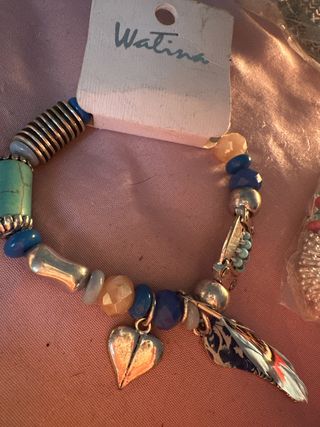 Bonita pulsera de la marca Watina con varios dijes. - Dijes de corazón y pluma. - Cuentas de diferentes formas y colores, incluyendo turquesa y azul. - Estilo bohemio y llamativo. - tengo mas de mas clases preguntar sin compromiso