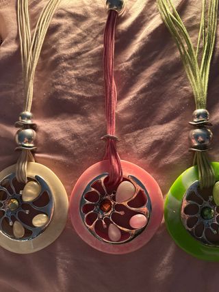 Conjunto de tres collares con colgantes circulares y detalles metálicos. - Colgante de color rosa con piedras claras y una central anaranjada. - Colgante de color crema con piedras claras. - Colgante de color verde con piedra central oscura.
