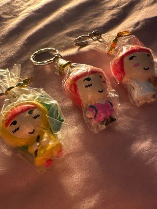 Conjunto de tres llaveros con figuras de estilo kawaii. - Figuras de estilo caricaturesco. - Cada figura viene envuelta individualmente. - Incluye anilla y cadena para llavero.