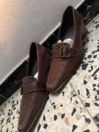 Elegantes zapatos de tacón bajo con un diseño clásico. - Acabado en piel. - Detalle de hebilla. - Costuras decorativas.