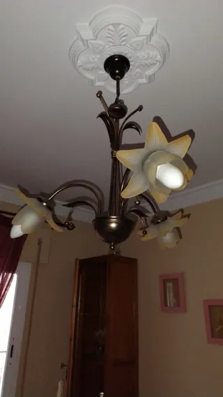 Elegante lámpara de techo con un diseño de forja en tonos marrones - Estructura principal de metal. - Tulipanes de cristal blanco.