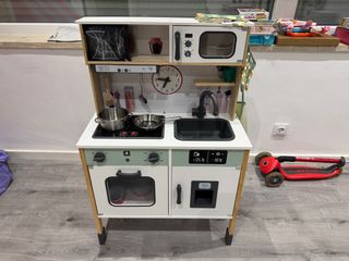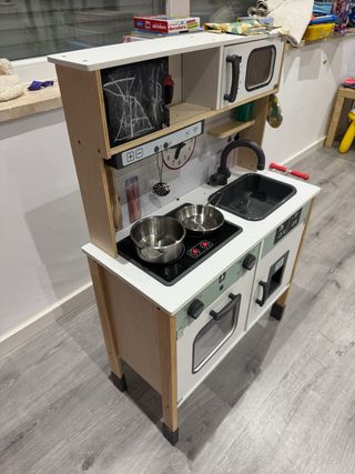 Divertida cocina de juguete de madera, ideal para los más pequeños. Cuenta con un diseño moderno y funcional. Con sonidos en la vitroceramica. En muy buen estado, apenas ha jugado con ella. - Incluye horno, microondas, fregadero, delantal y guante, - Estructura de madera resistente. - Accesorios de cocina como ollas y sartenes.