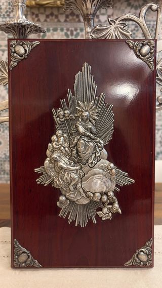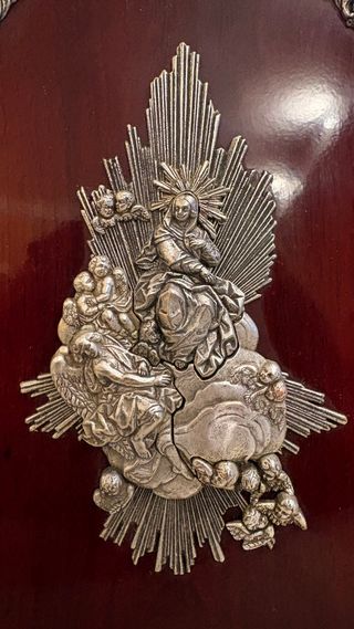 Relieve en metal plateado que representa la Asunción de la Virgen. - Diseño detallado con arcangeles, querubines y rafagas de rayos - Acabado en metal plateado. - Base en medera lacada con esquinerass Medidas relieve metal 19 x 11,5 base madera 26x 16,5 No dudes en ofrecer tu propuesta de precio!