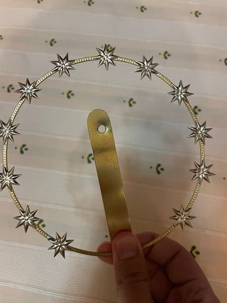 Aro de latón y estrellas de latón plateada. Con Platina. Este aro está adornado con estrellas y es ideal para virgenes o imágenes de hasta 60 cm de altura. - Diseño circular con múltiples estrellas. - Acabado metálico brillante. - Diámetro del aro: 14 cm
