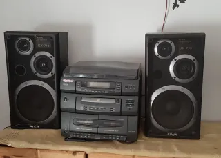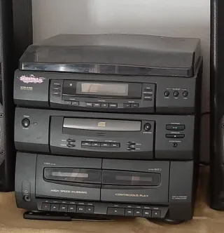 Equipo de música Sanyo en color negro. - Reproductor de CD. - Doble pletina de cassette con alta velocidad de copiado. - Radio. - Tocadiscos.