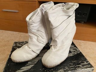 Botines de piel auténtica en color blanco con tacón alto elegante. Diseño muy favorecedor con efecto fruncido en la caña y cierre lateral con cremallera. ✔ Piel auténtica ✔ Muy cómodos y estilizan la pierna ✔ Tacón alto estable ✔ Color blanco muy fácil de combinar Perfectos para looks elegantes, fiestas, eventos o para combinar con vestidos y vaqueros. Están en buen estado, con señales normales de uso pero bien conservados (ver fotos). Entrega en mano o envío por Wallapop. Talla: 38