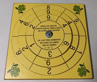 Juego educativo para practicar multiplicaciones. - Ruedas de madera con números. - Gira los discos hasta que el resultado de la multiplicación de los tres números de cada columna sea el mismo, en este caso, Nivel 2, 72. También hago Nivel 1 y Nivel 3